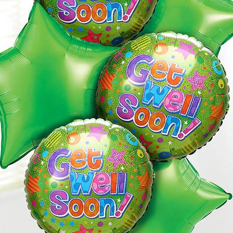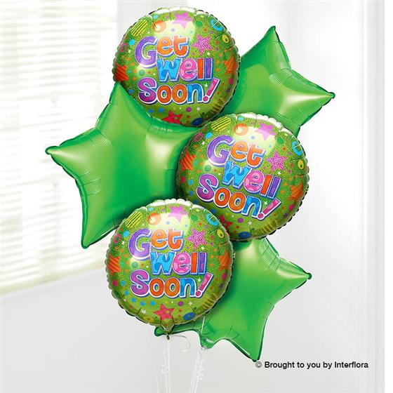 Send your get well wishes with our Get Well Soon Balloon Bouquet. Including three green star-shaped balloons and three cheerful 'Get Well Soon' balloons, this helium balloon bouquet is sure to brighten their day.