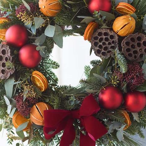 A classic Christmas wreath of fresh foliage and dried fruits, expertly arranged with care by a local florist.