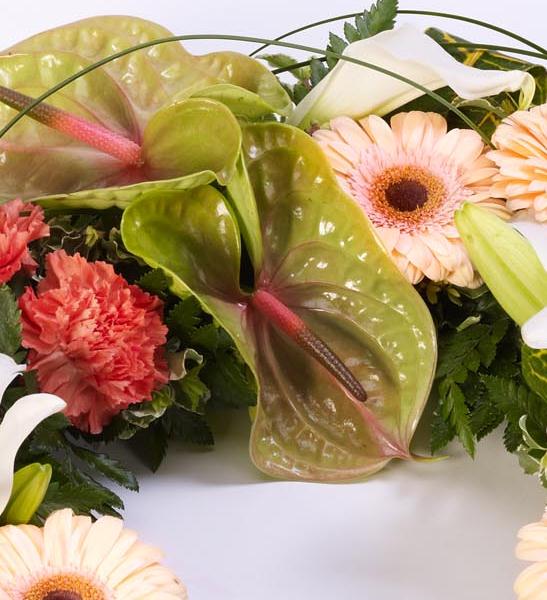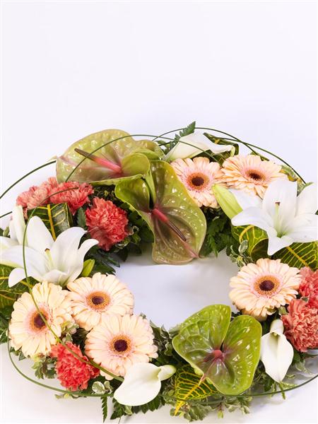 An elegant wreath featuring an exotic mix of anthuriums, calla Lily, Gerbera, Lily and carnations in green, orange and white. Tropical foliage and looped steel grass give it a contemporary feel. Approximate diameter 55cm (21 inches).