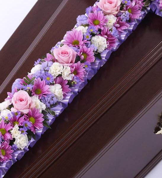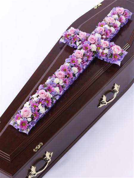 A classic cross covered with a mass of pink and lilac flowers including roses, spray carnations, spray chrysanthemums and September flower. Approximate height 122cm (4ft).