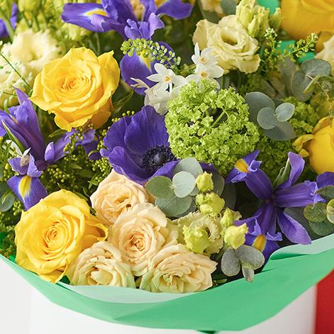 A selection of fresh blooms including at least three yellow roses and three purple iris, expertly handcrafted into a stunning bouquet.