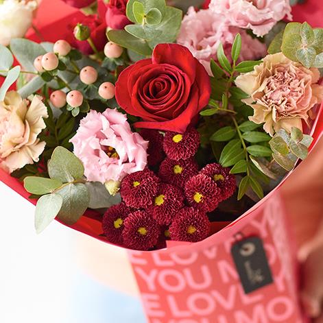 A gorgeous mix of romantic blooms, exquisitely arranged by an artisan florist and safely tucked in a beautiful giftbox. It'll feature blooms in classic Valentine's colours including cerise, burgundy and soft pink.