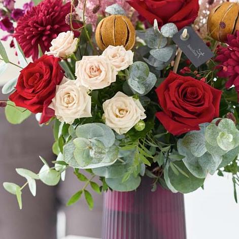 A stunning one off handblown vase filled with resplendent festive blooms – arranged exquisitely by a local florist. It'll feature blooms in rich red and green shades, with peach and cream highlights and pops of burgundy and cerise.