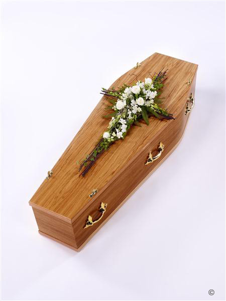 Striking white Dendrobium orchids, white large-headed roses and trailing ivy are entwined around twisted willow, hazel and cornus to create this contemporary cross.