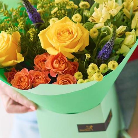 A bright and beaming handcrafted bouquet in a cheerful gift box.