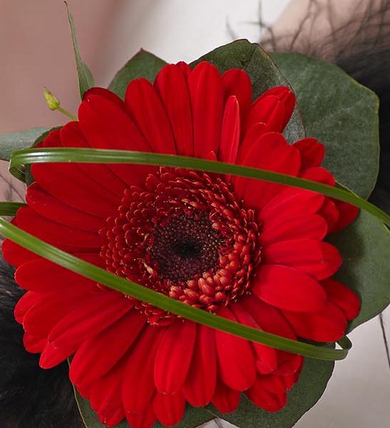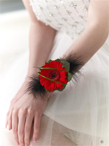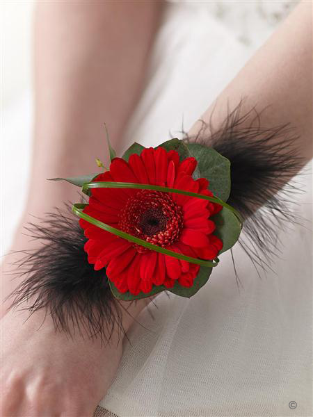 Red Gerbera and Feather Wrist Corsage zoom 2Red Gerbera and Feather Wrist Corsage zoom 3