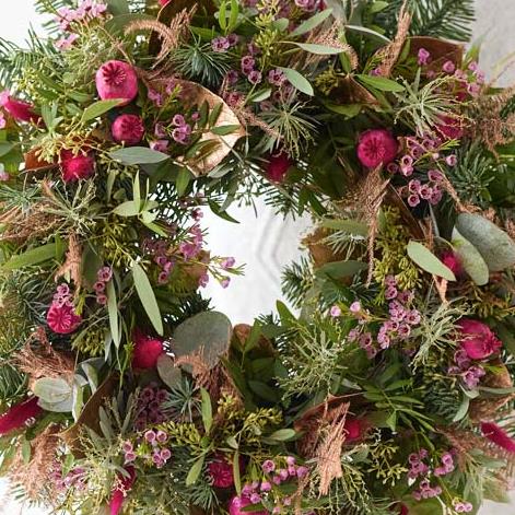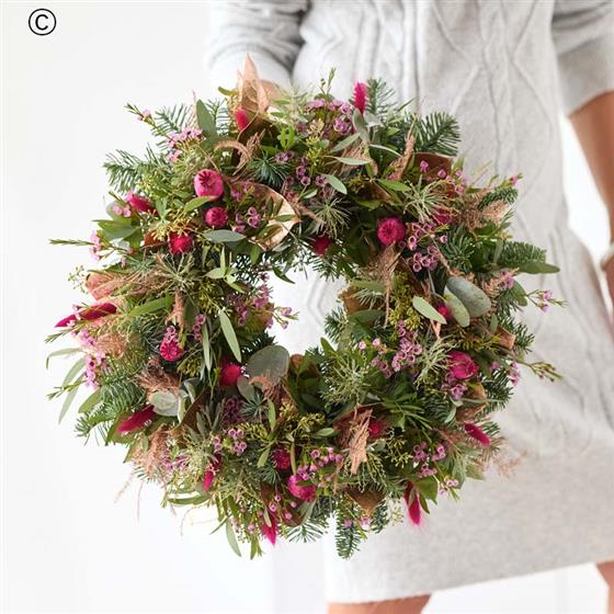 A gorgeous fresh flower wreath created in a fresh, modern style. It'll feature fresh flowers and foliage. Expect cerise and purple tones, plus blooms in soft pink, peach or lilac shades. It might also feature dried flowers or foliage painted in copper or rose gold.